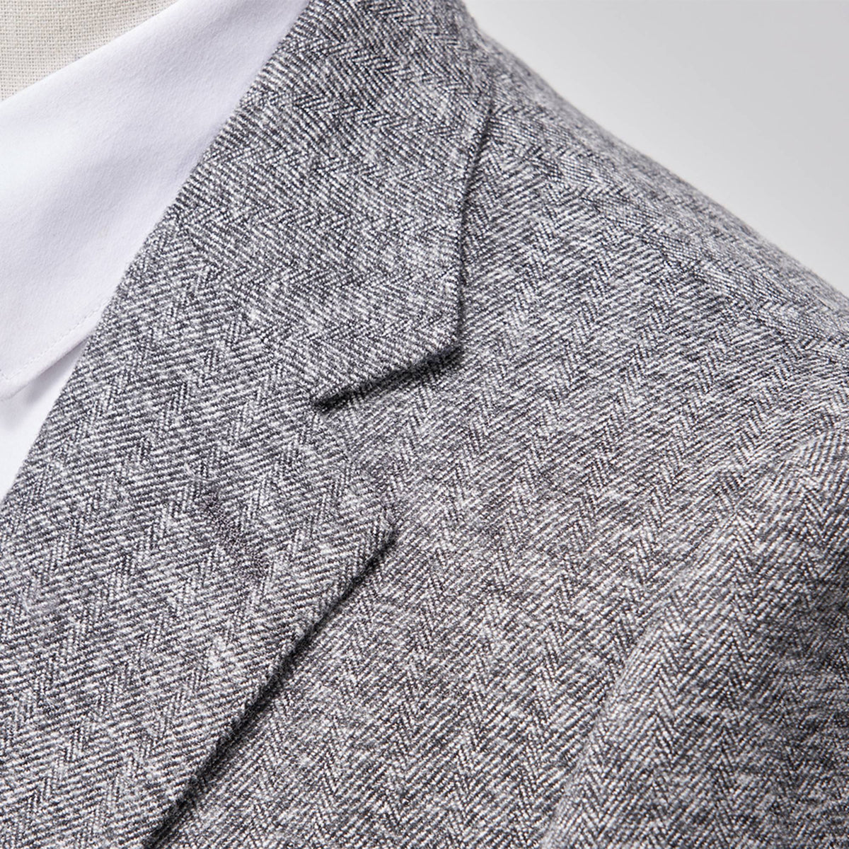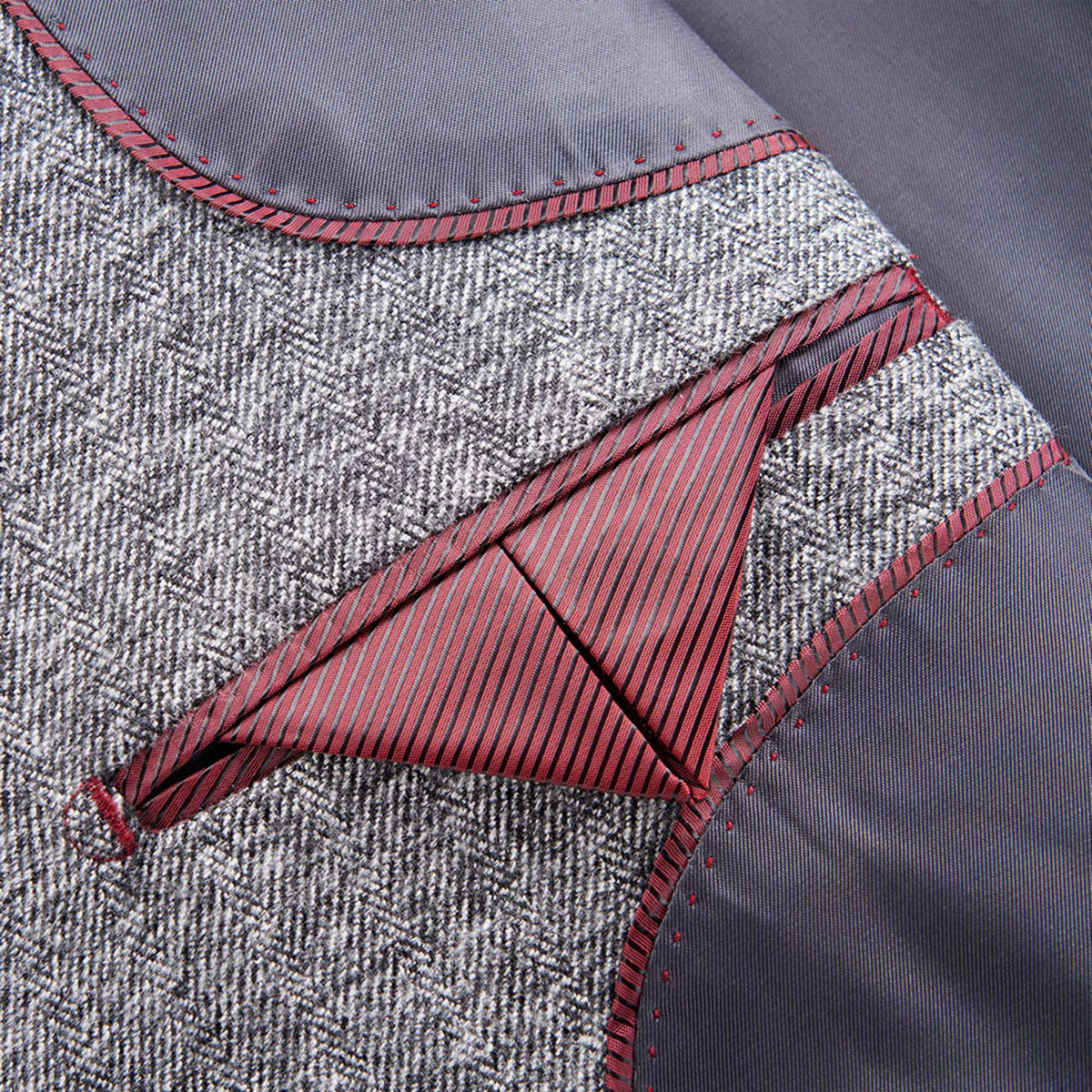 A masterful interlocking herringbone weave creates a depth of texture that speaks to a refined stoicism. Sharp lapels and contrasting dark obsidian buttons provide a precise silhouette designed for the man who commands the room without speaking. The interior reveals hidden artisanal striped piping, a secret mark of sophistication for the discerning eye.