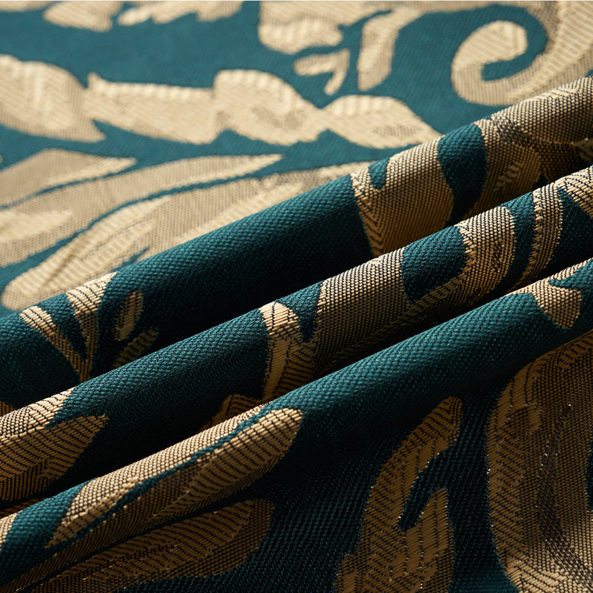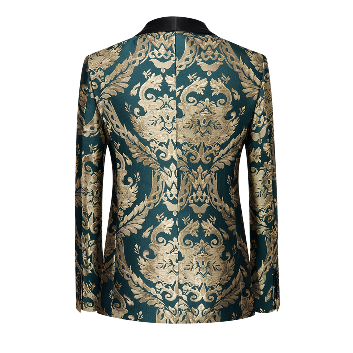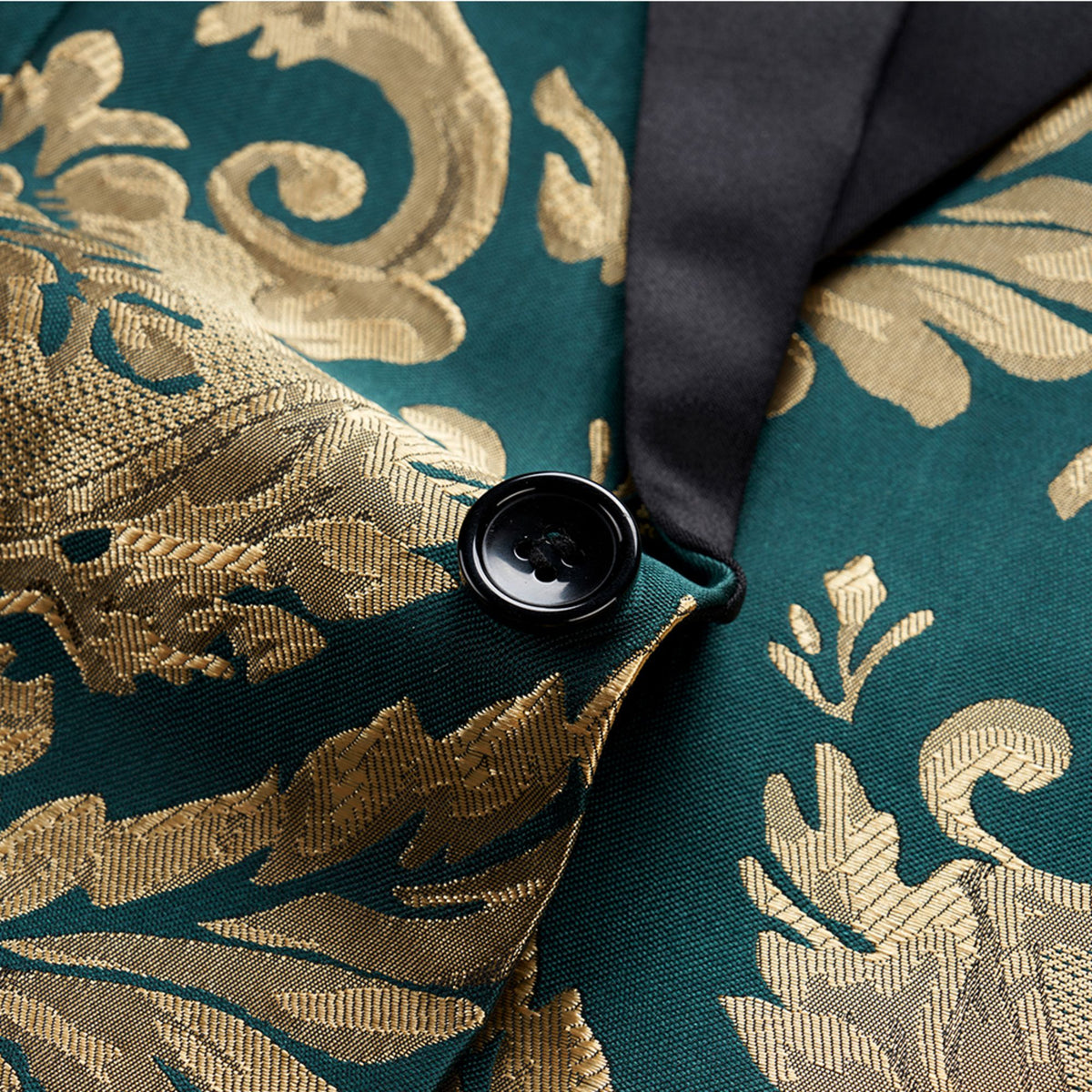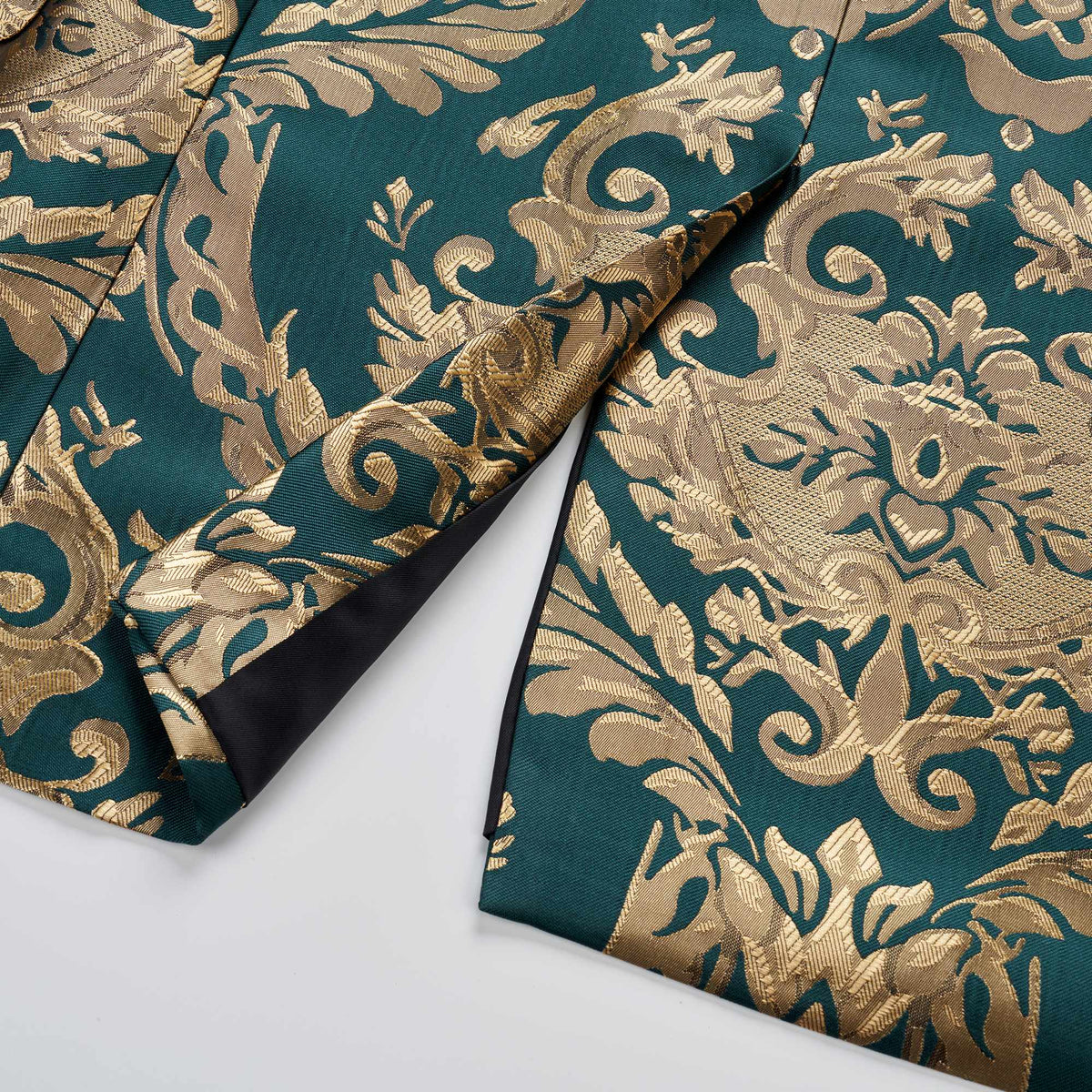 Intricate gold filigree wanders across a deep emerald jacquard, a testament to unyielding luxury and aristocratic grace. The sharp black satin shawl lapel frames the piece, while the coordinated pocket square detail captures the essence of a high-stakes midnight gala.