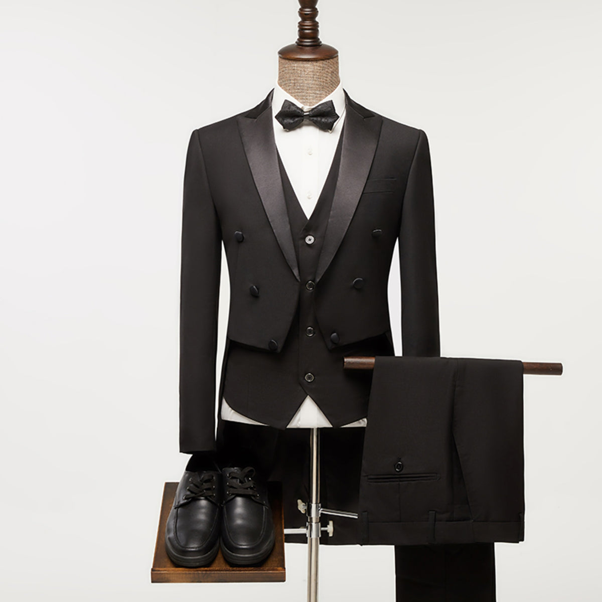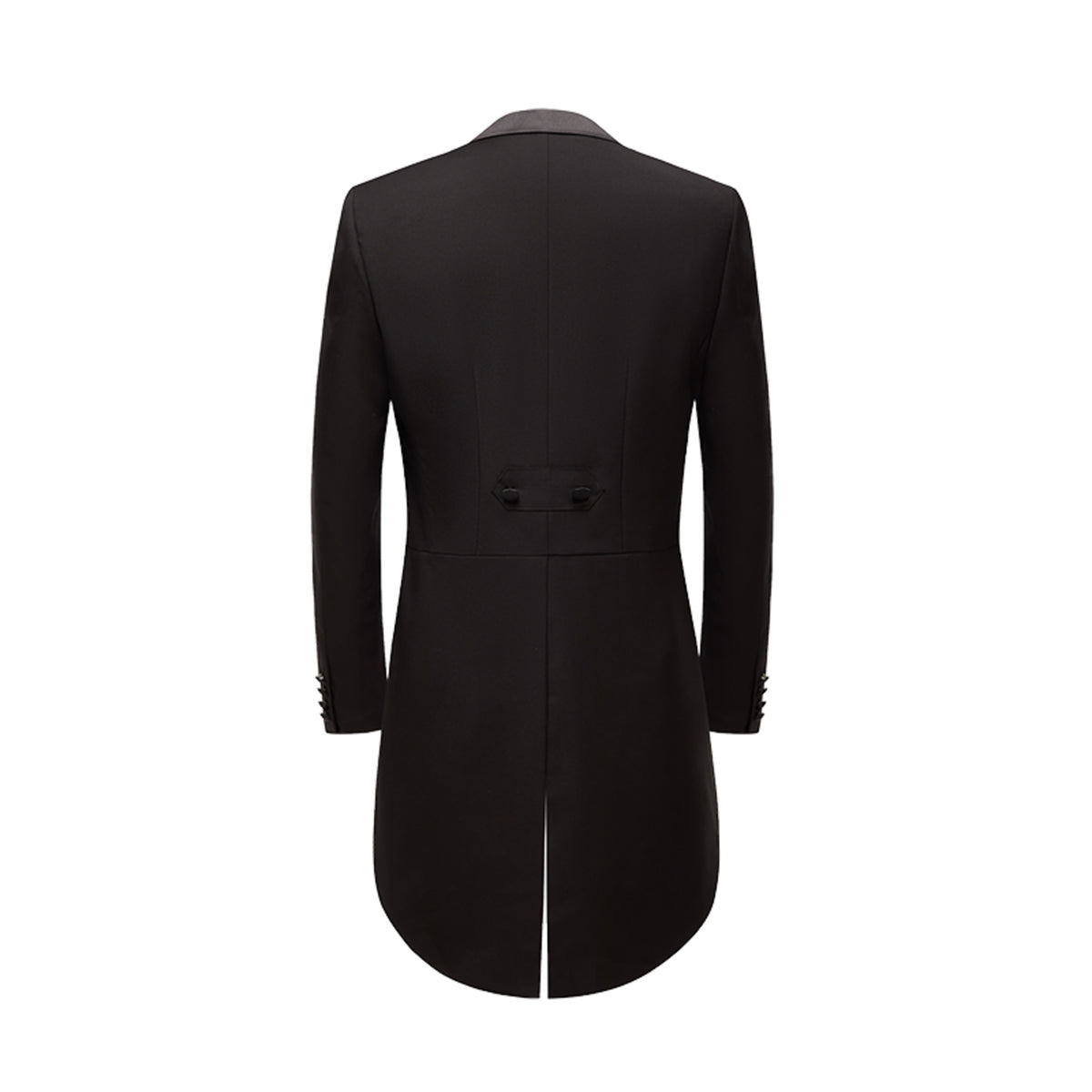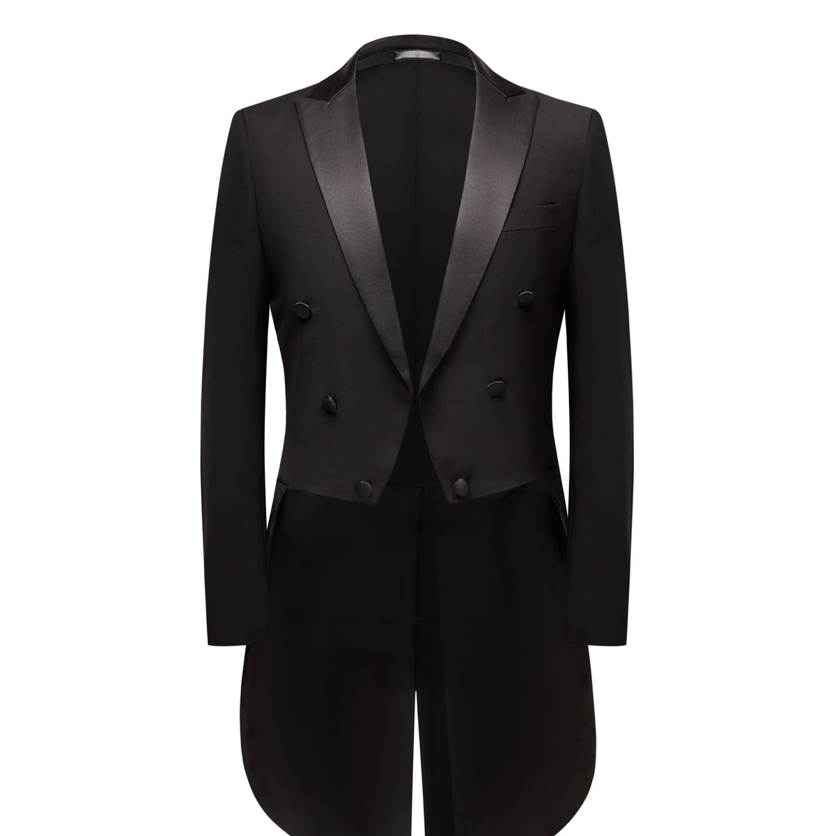 A masterwork of formal architecture, this deep obsidian tailcoat features sharp satin peak lapels that slice through the low light of a grand opera house. The sculpted double-breasted silhouette and cascading swallowtail back command a presence of timeless authority and refined heritage.