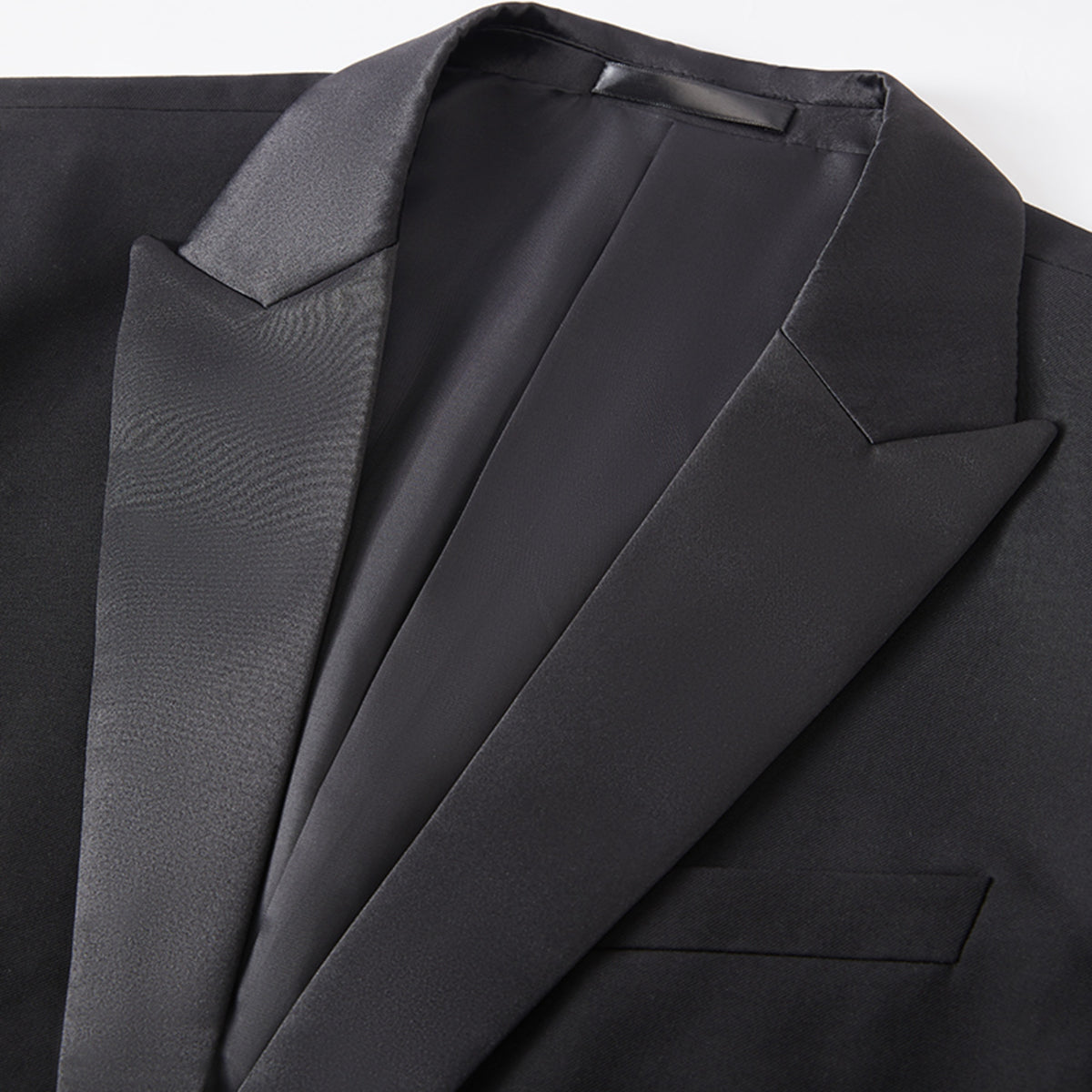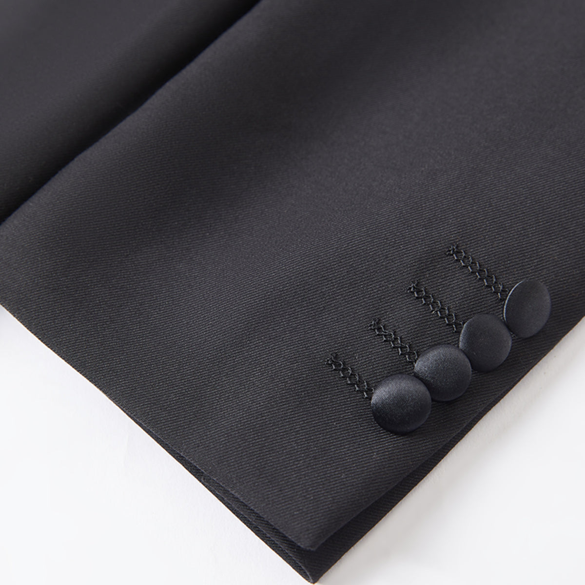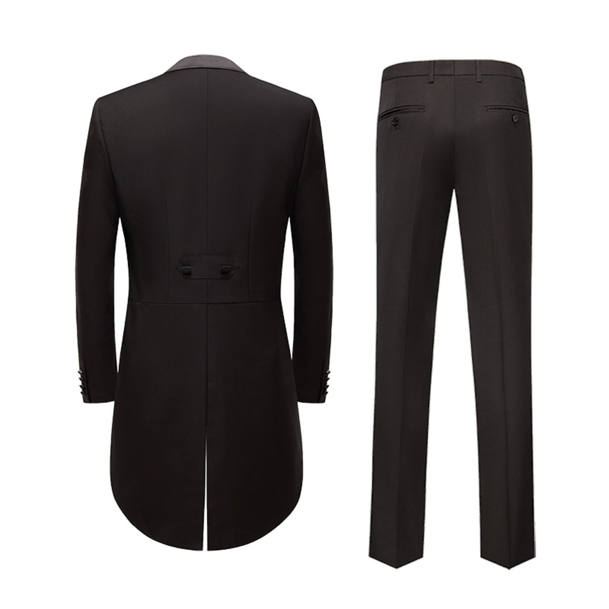 A masterwork of formal architecture, this deep obsidian tailcoat features sharp satin peak lapels that slice through the low light of a grand opera house. The sculpted double-breasted silhouette and cascading swallowtail back command a presence of timeless authority and refined heritage.