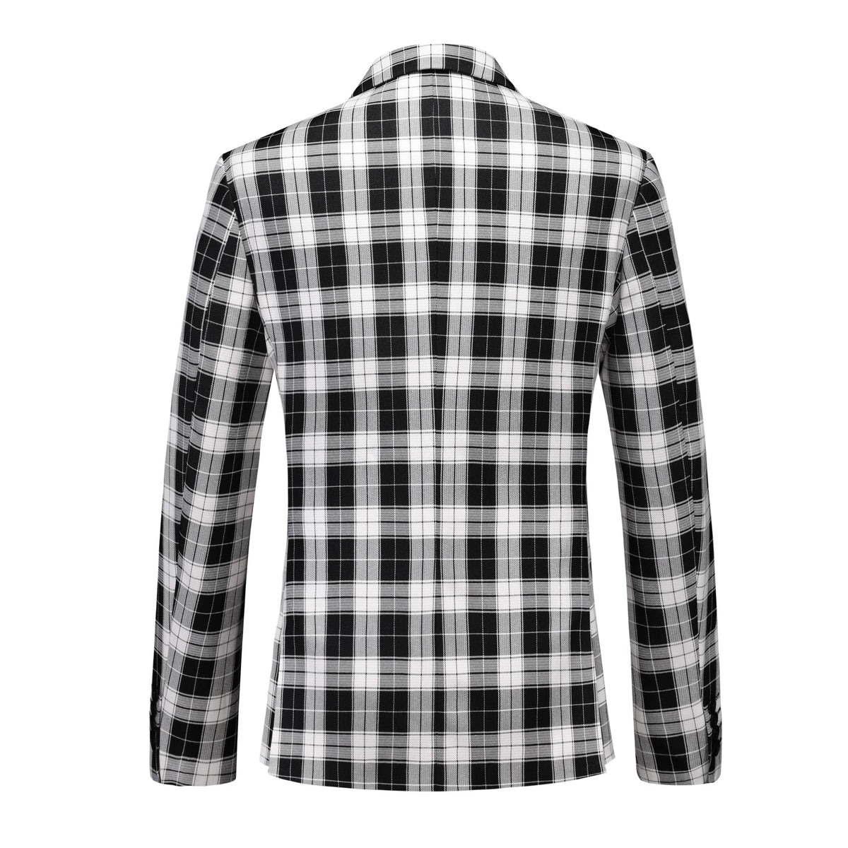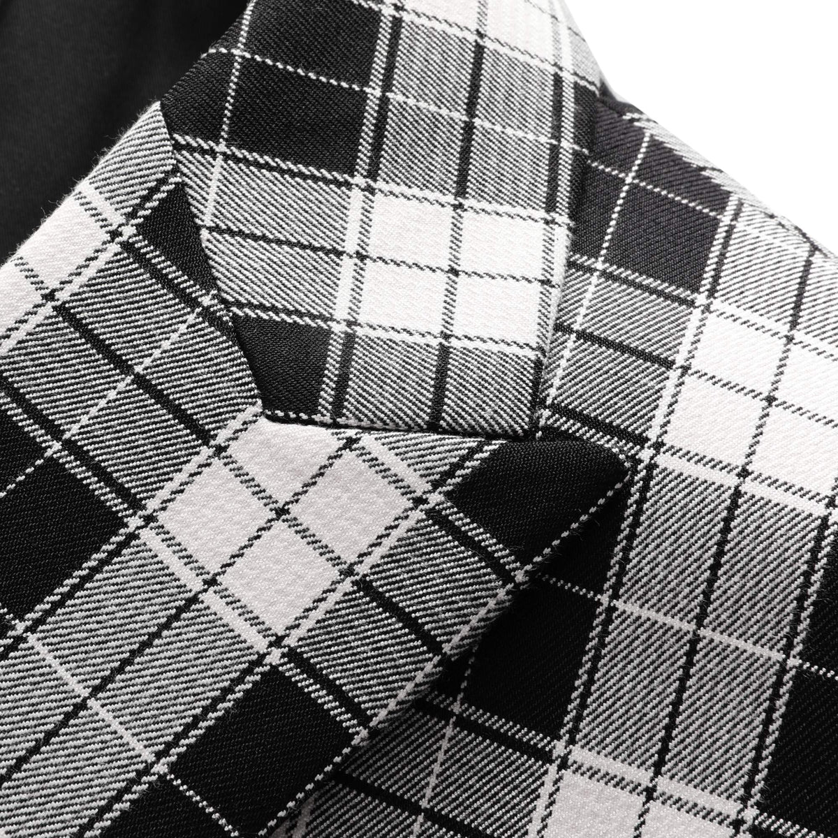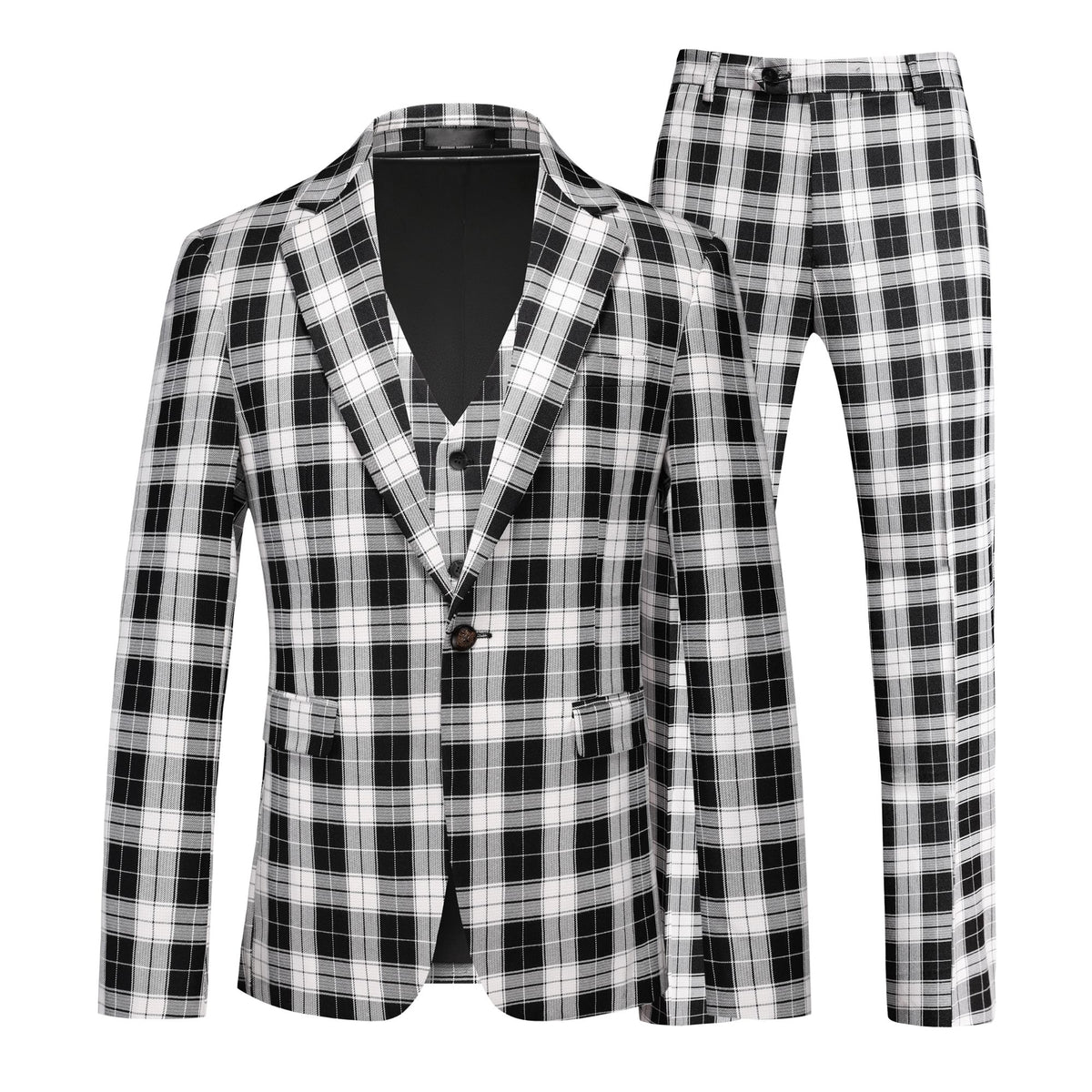 This men's suit ensemble features trousers, a vest, and blazers (both single-breasted and double-breasted options are shown). The striking design showcases a timeless black and white plaid pattern, composed of intersecting lines forming a classic grid. The fabric appears smooth and tailored, lending itself to a sophisticated and sharp aesthetic suitable for various formal and semi-formal occasions.