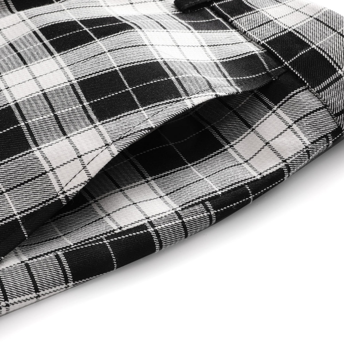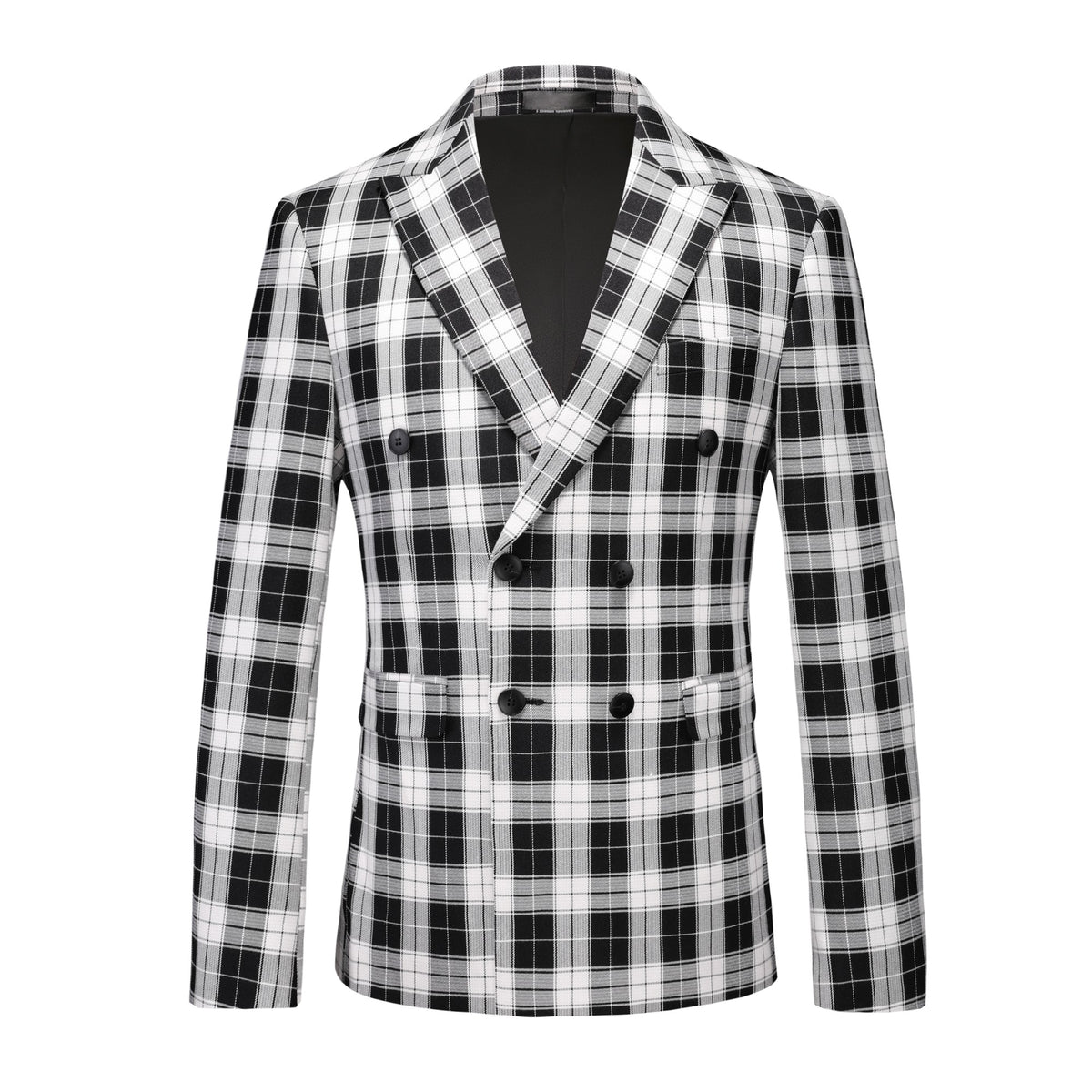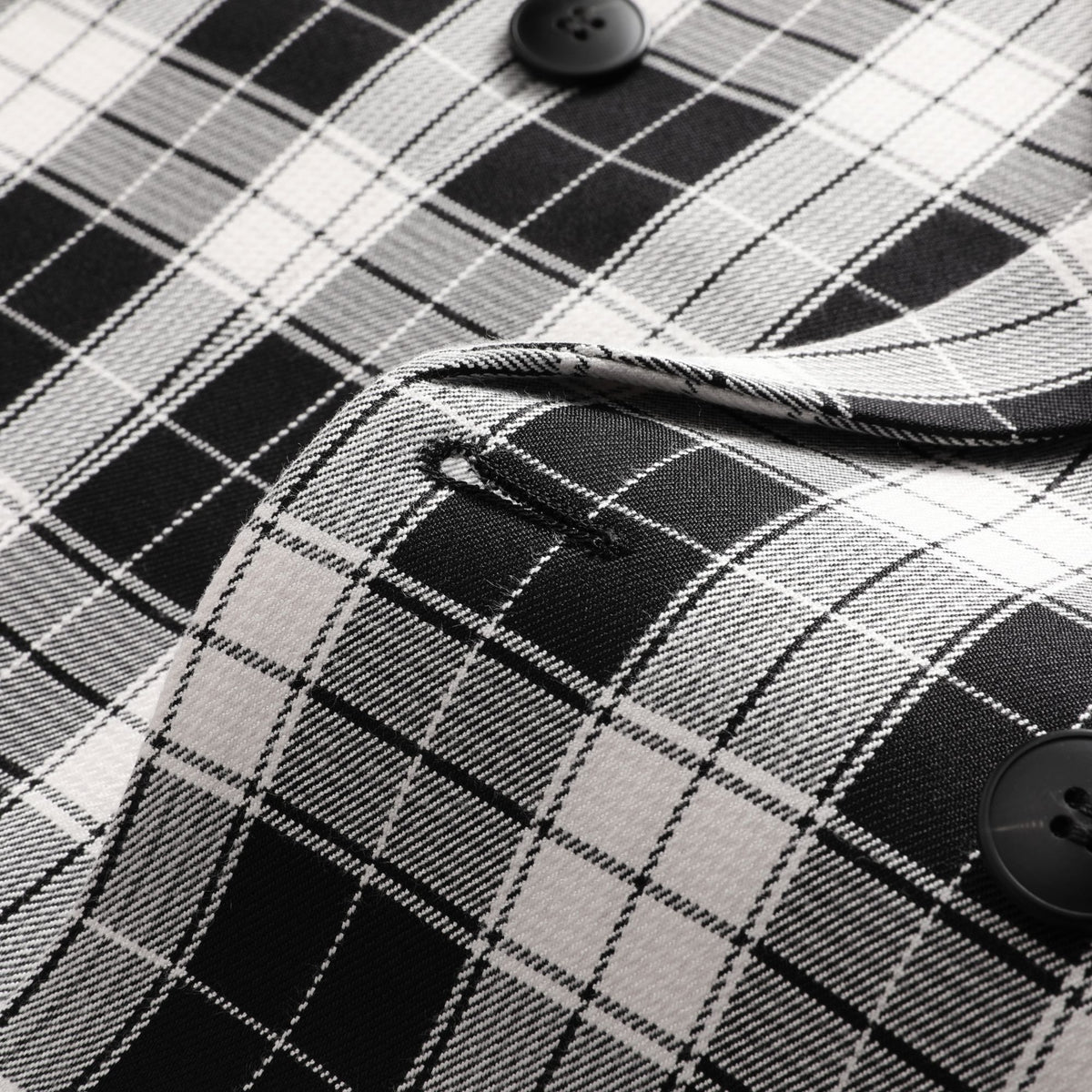 This men's suit ensemble features trousers, a vest, and blazers (both single-breasted and double-breasted options are shown). The striking design showcases a timeless black and white plaid pattern, composed of intersecting lines forming a classic grid. The fabric appears smooth and tailored, lending itself to a sophisticated and sharp aesthetic suitable for various formal and semi-formal occasions.