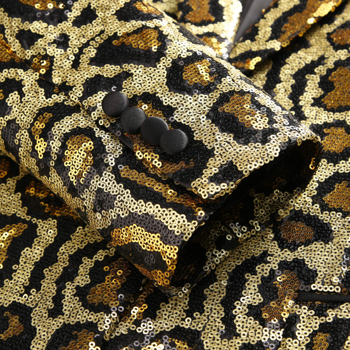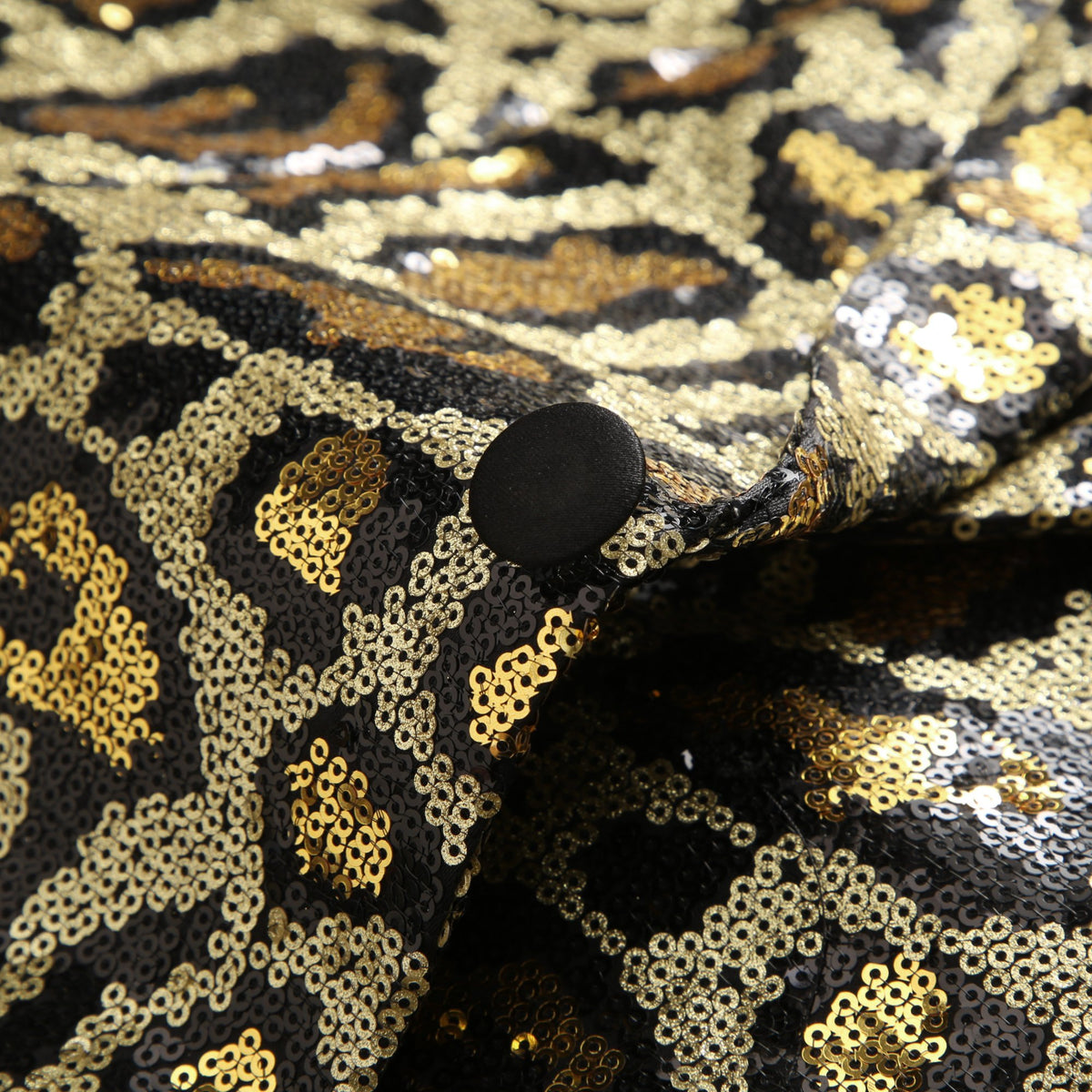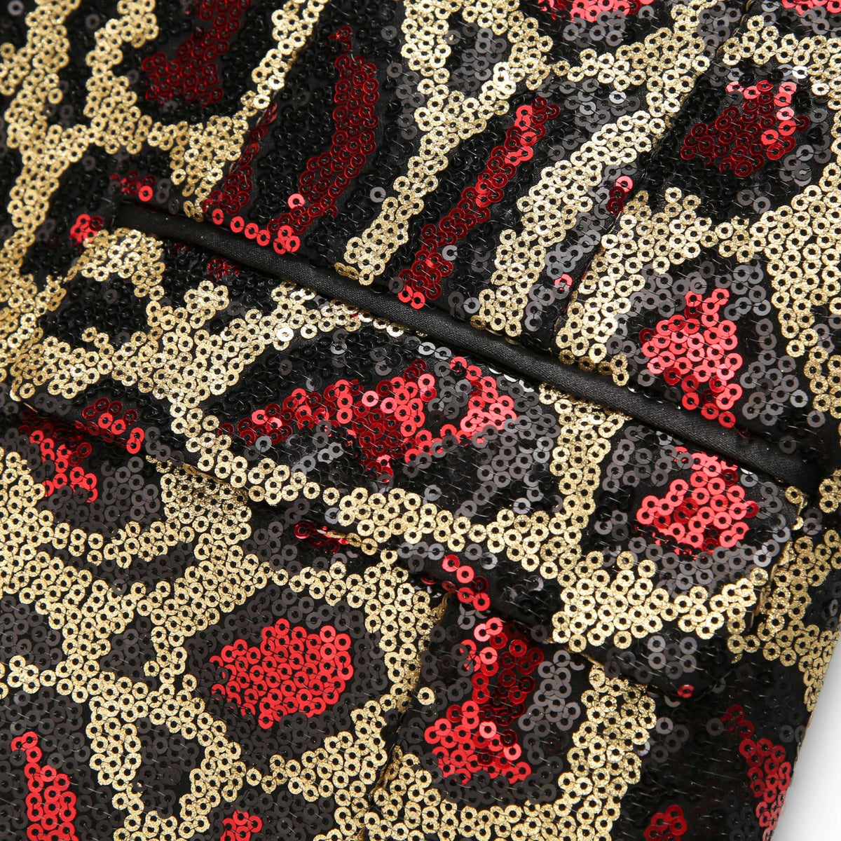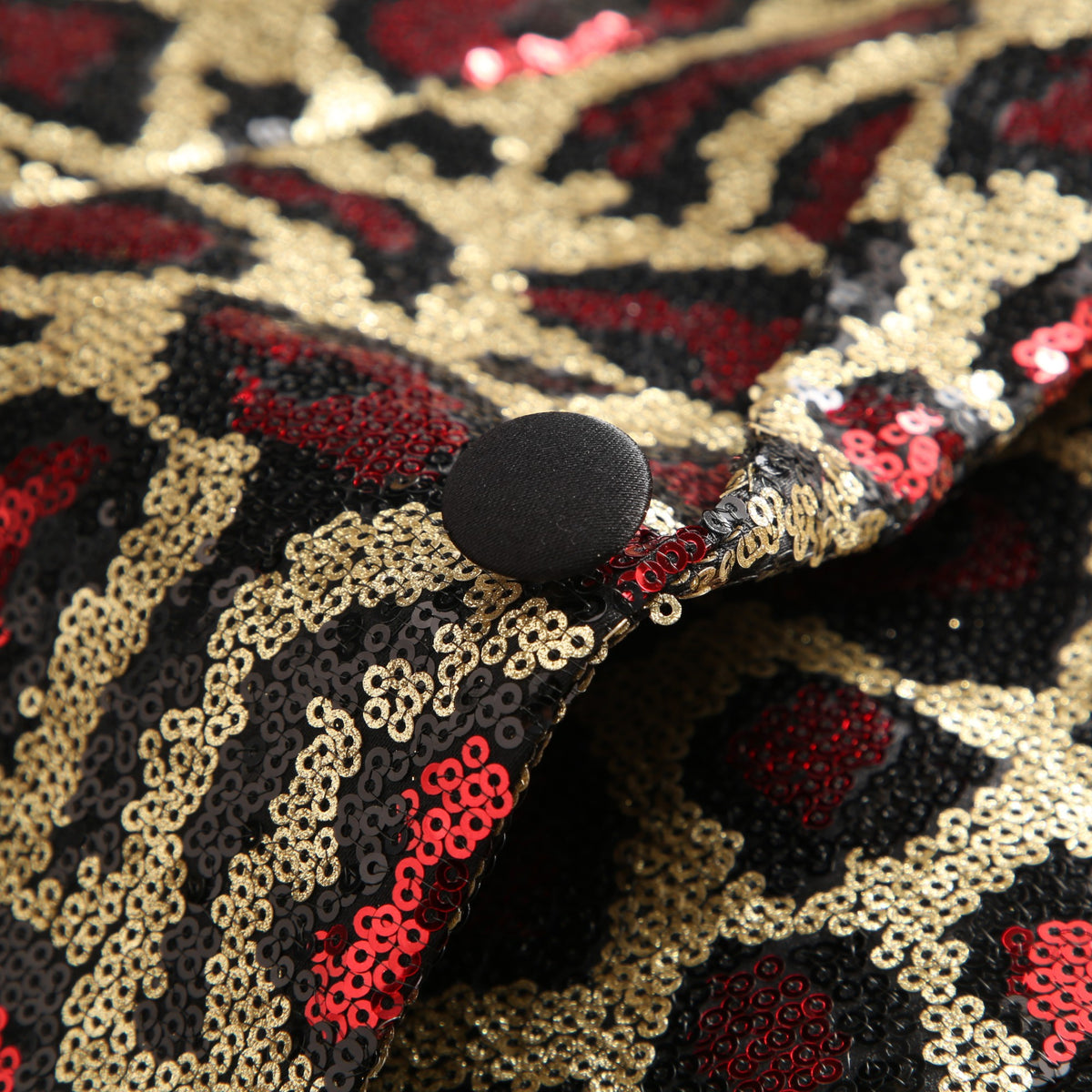 This striking blazer is adorned with a full sequin embellishment, forming a vibrant animal print pattern. It features a sophisticated notched lapel and a single-button closure, with coordinating button details on the cuffs. The design is available in a luxurious gold and black leopard print, and another bold variant incorporating red sequins into the gold and black pattern.