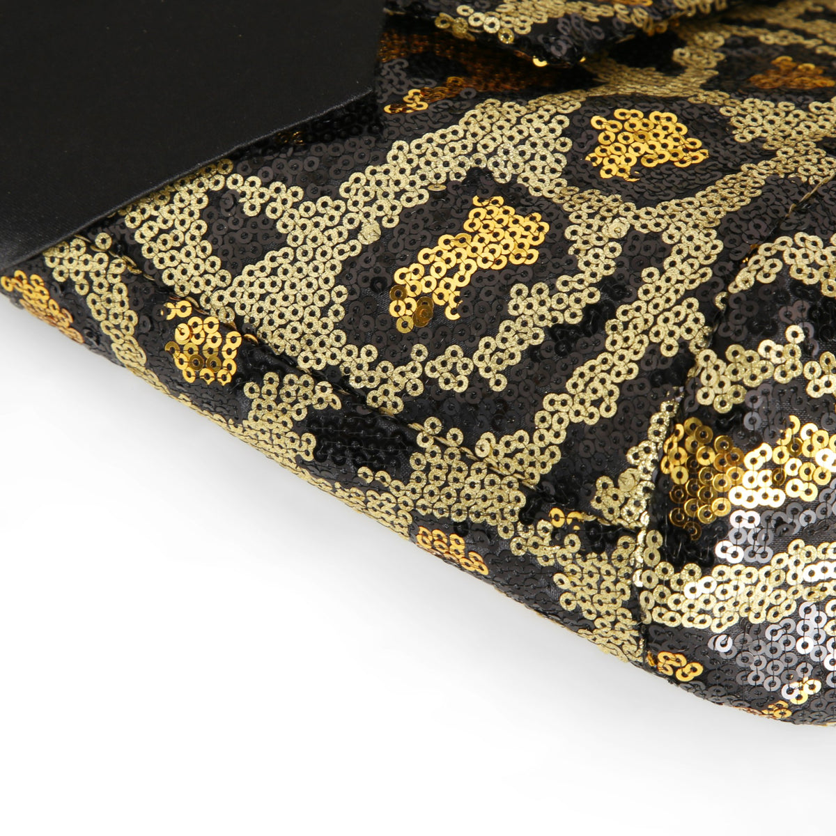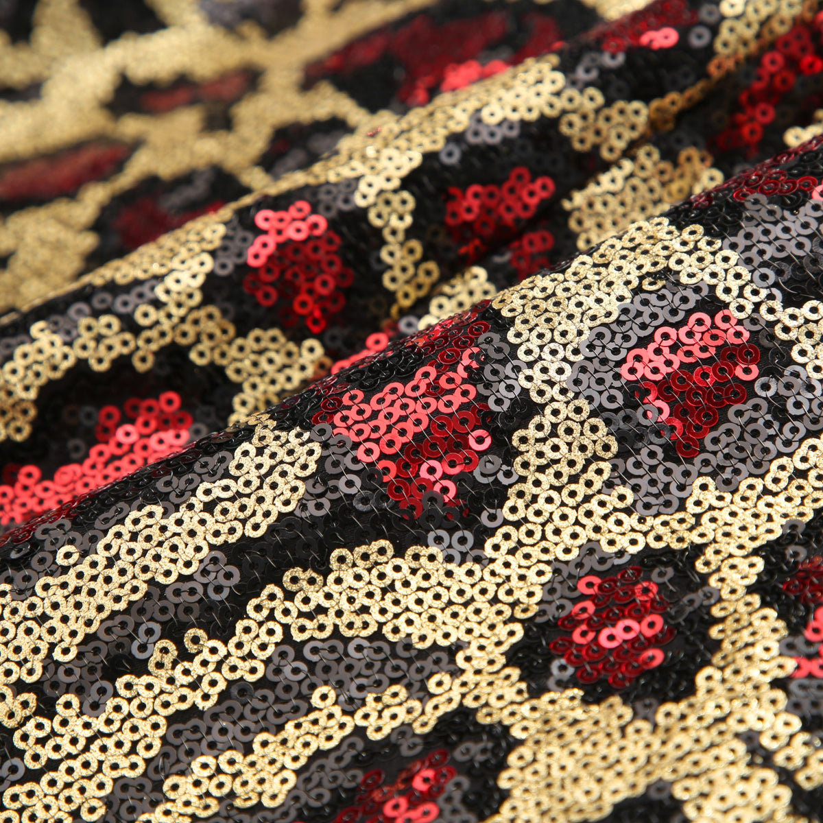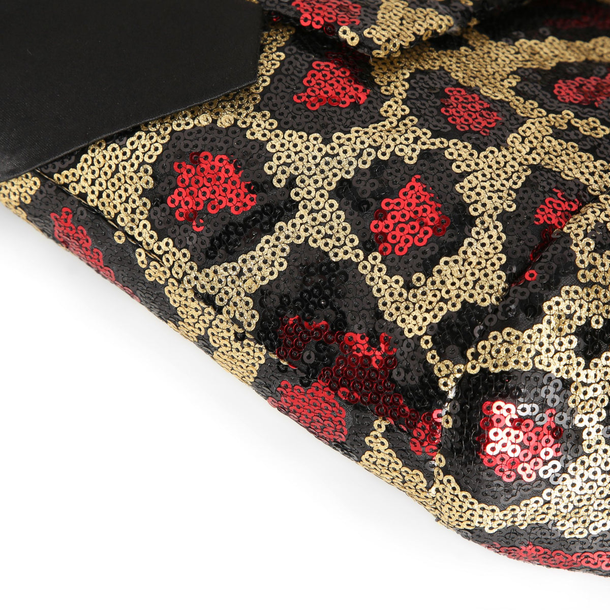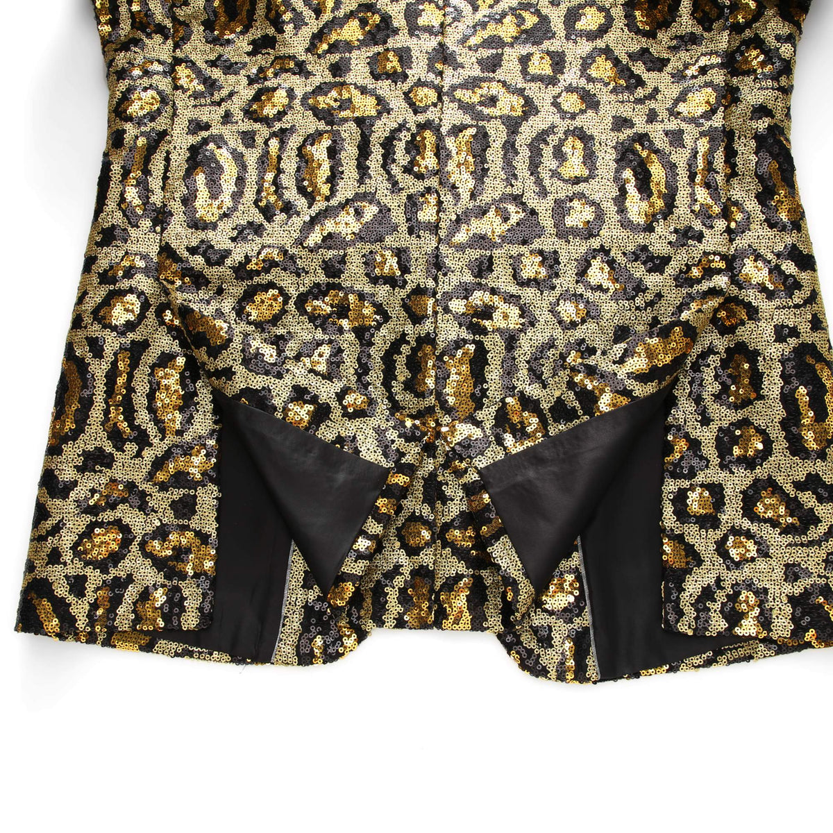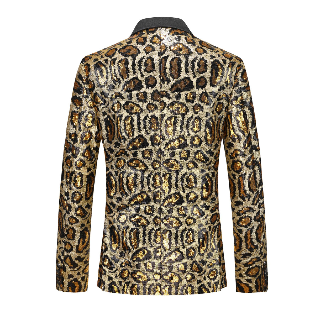 This striking blazer is adorned with a full sequin embellishment, forming a vibrant animal print pattern. It features a sophisticated notched lapel and a single-button closure, with coordinating button details on the cuffs. The design is available in a luxurious gold and black leopard print, and another bold variant incorporating red sequins into the gold and black pattern.